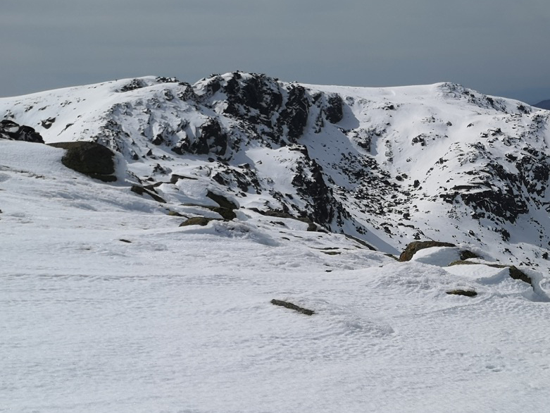 Poco más arriba, la morrena paleoglaciar, en el lado izquierdo del antiguo glaciar del Cuerpo de Hombre. Ese resto geológico es muy reciente: se formó hace tan sólo 8.000 años, al final de la última glaciación. Hoya Cuevas queda a un lado; al otro, la preciosa y encharcada pradera de Navamuño, con La Muela al fondo.